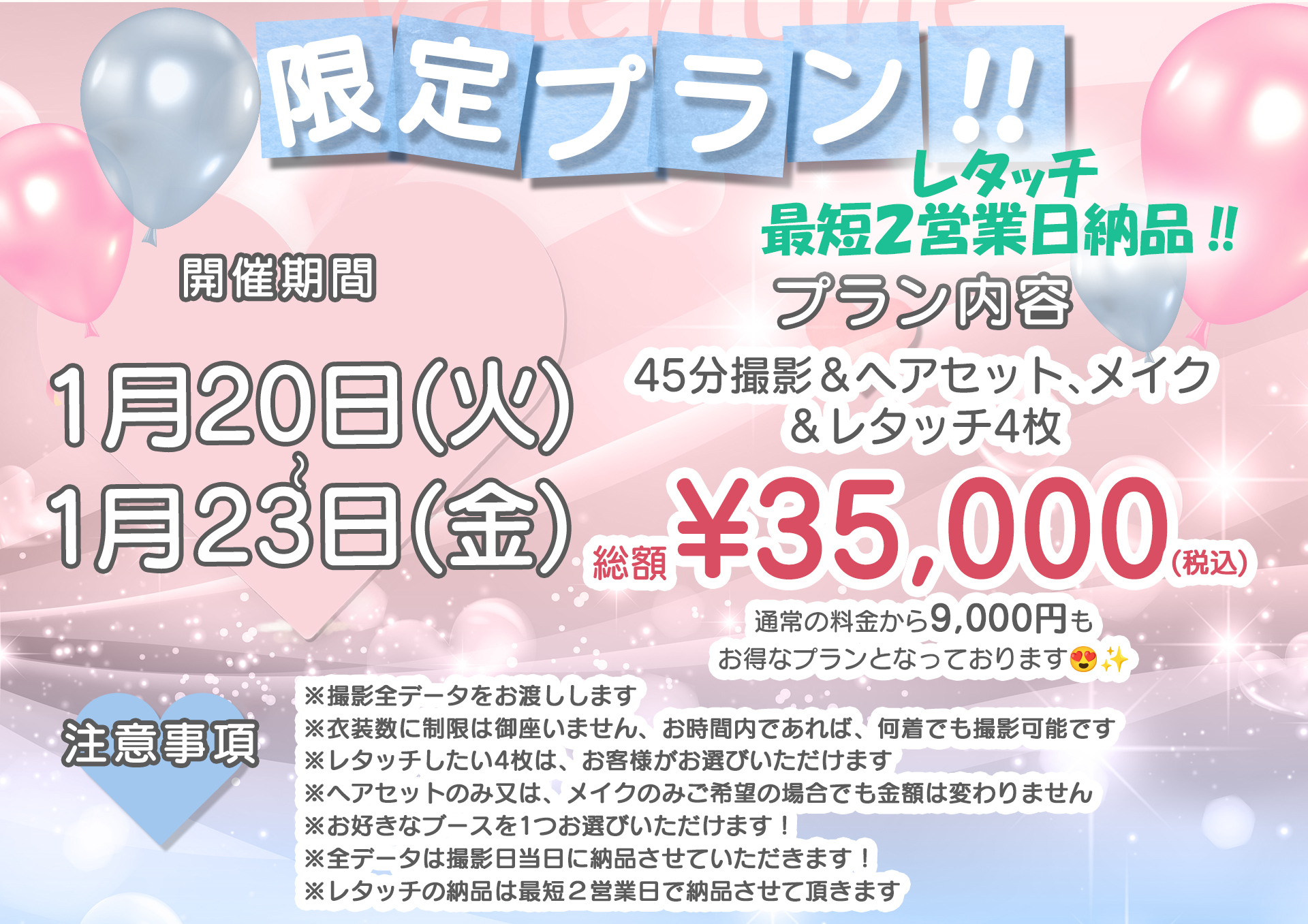 45分撮影+ヘアセット、メイク+レタッチ4枚