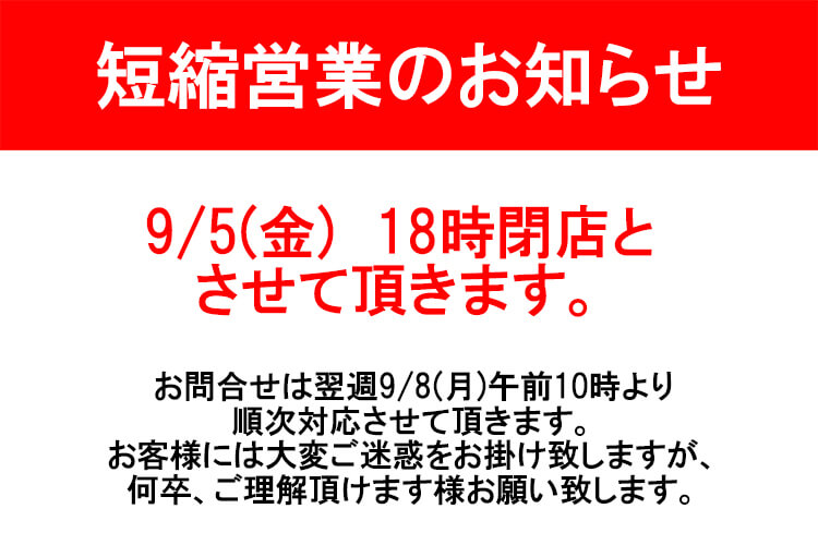 9月5日(金)営業時間短縮のお知らせ
