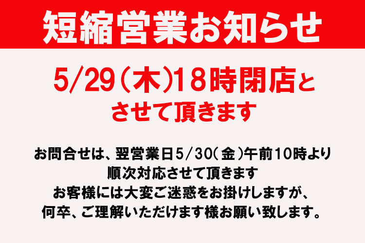 5月29日(木)営業時間短縮のお知らせ