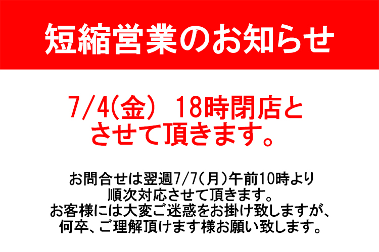 7月4日(金)営業時間短縮のお知らせ
